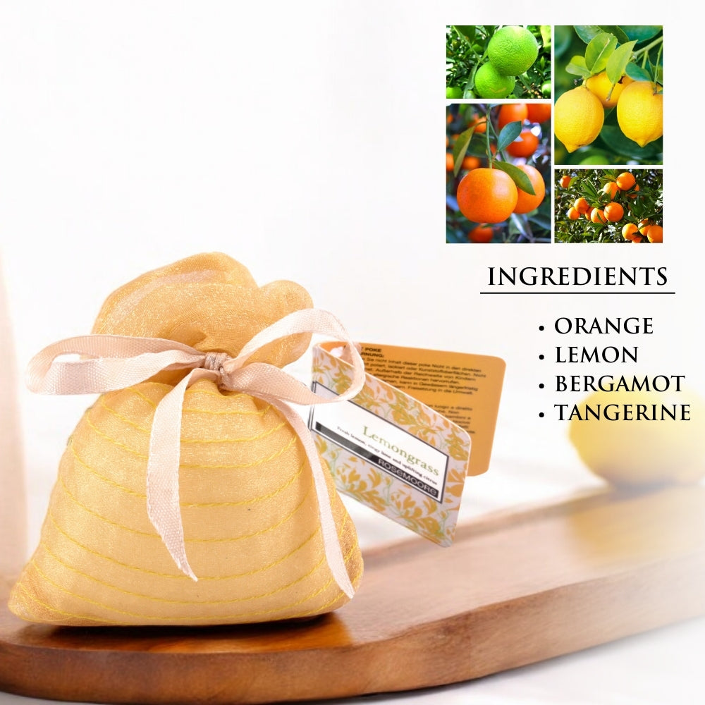 Scent Sack Lemon GrassΒ created from Lemongrass is a fragrant plant which is widely cultivated in many parts of tropical and sub-tropical South East Asia and Africa. Lemongrass is the perfect fragrance when you need an energy boost. It has a very crisp aroma, with an unusual citrusy lemony feel with a dash of botanical grasses. It is highly raved by both the class and the mass.